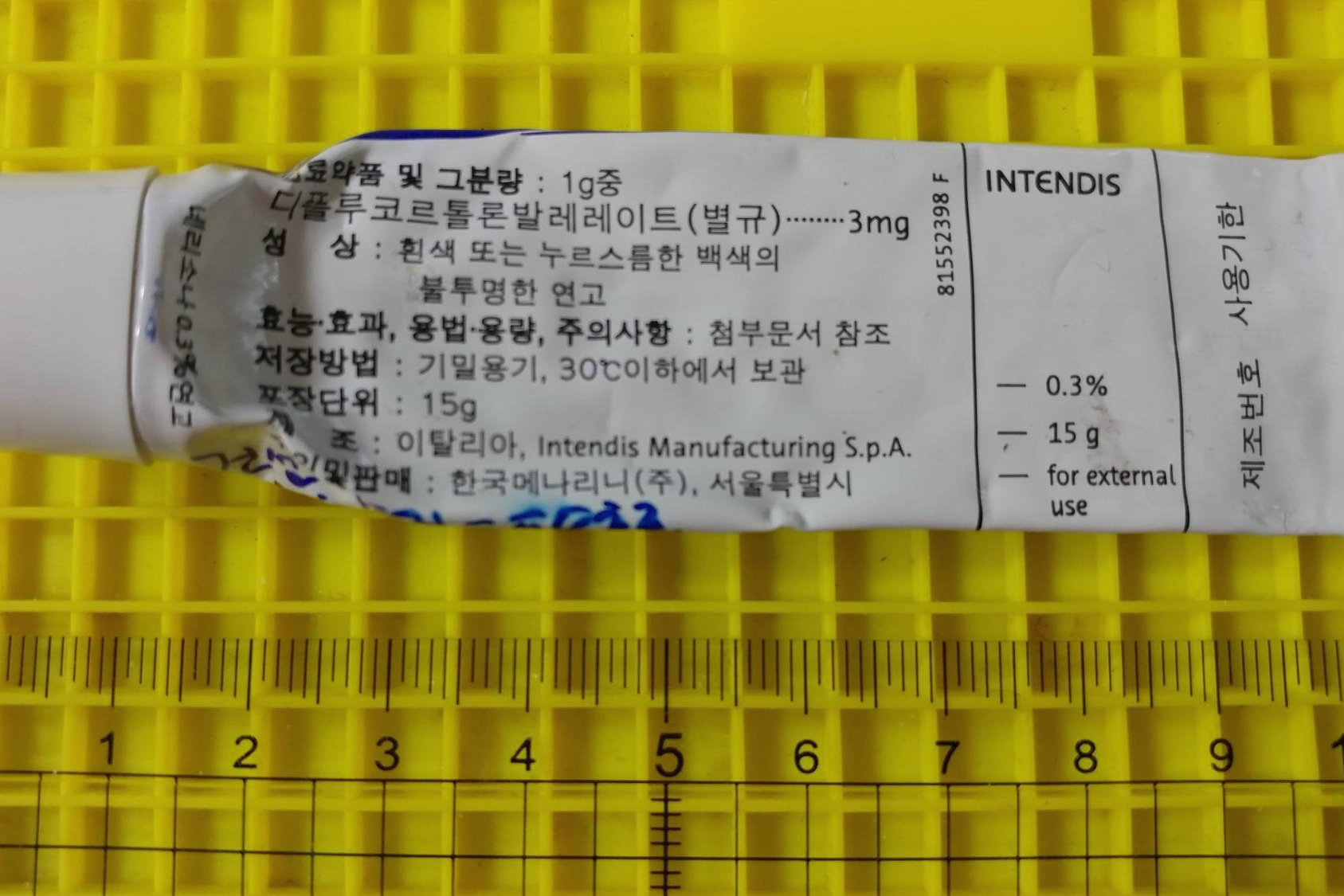 네리소나 연고 원료 약품 및 그 분량 항목을 보면 약제 1g에 디플루코르톨론발레레이트 성분 3mg 함유되어 있습니다. 0.3%인 것이죠.