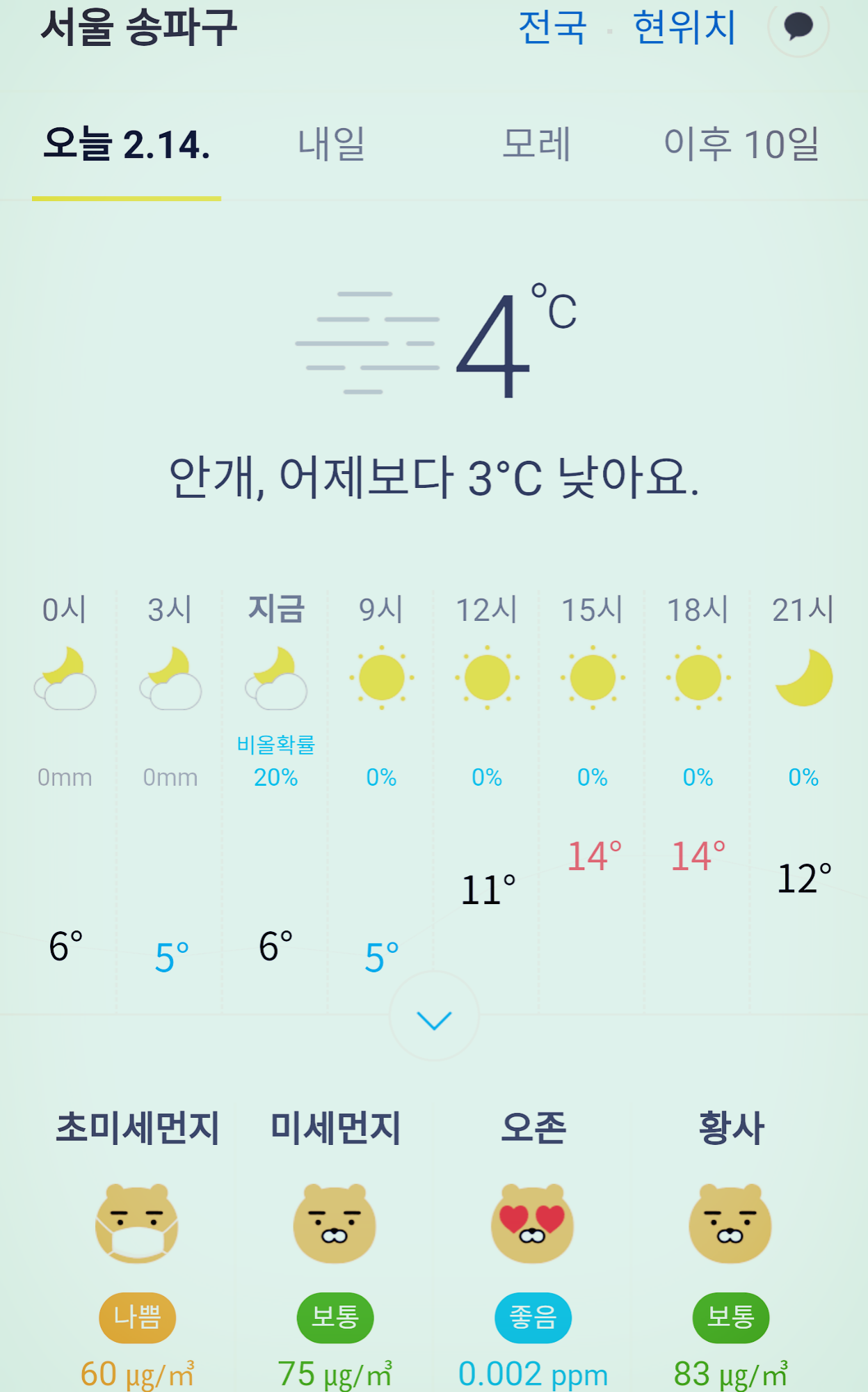 서울 강남 송파구 오늘의 날씨 2020년 2월 14일
