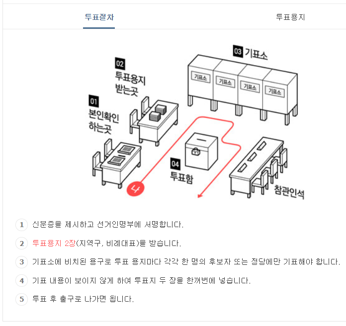 지역구 국회의원 투표와 비례대표 정당 투표, 해서 1인 2표 행사합니다. 투표 용지도 두 장이라는 이야기겠지요. 용지마다 원하는 칸을 찾아 1번만 기표해야 합니다.