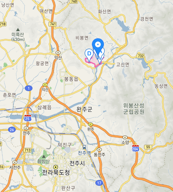 율곡리 외율마을은 완주군청에서 북쪽에 위치합니다. 고속도로 상에서 익산IC와 가깝습니다. 만경강 상류와 마을 일부가 접합니다. 근처에 고산공용터미널이 있고요.