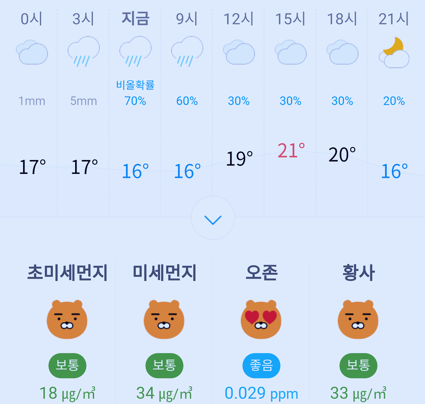대기상태는 어제와 비슷합니다 '보통' 수준이고요 비가 와도 '좋음'이 되지는 않네요