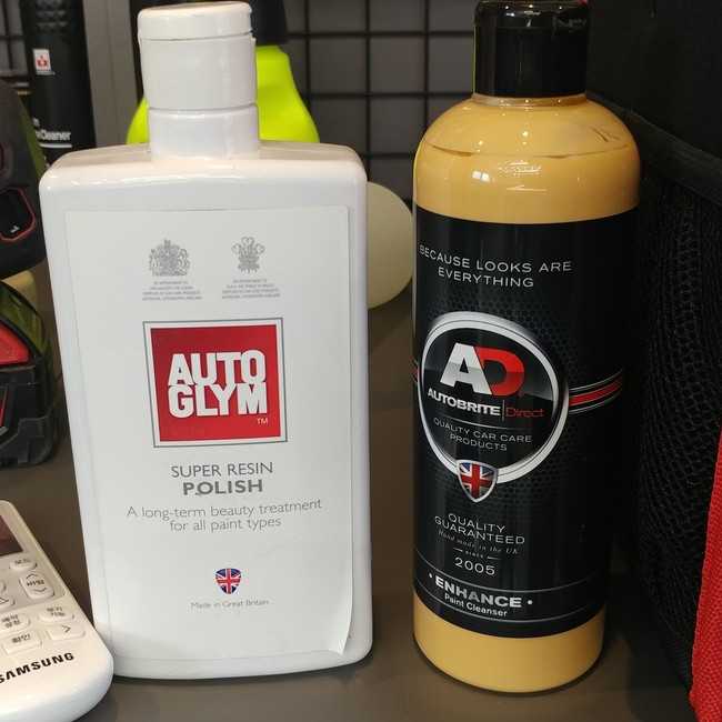 차, 자동차, 승용차, 셀프세차, self 세차, 카 디테일링, car detailing, 세차 용품, 세차 케미컬, 페클, 페클 작업, 페인트 클렌징, paint cleansing, 페클 케미컬, 페인트 클렌징 케미컬, 페인트 클렌저, paint cleanser, 오토글림 autoglym의 슈퍼 레진 폴리시 super resin polish 소위 NSRP (왁스성분 함유된 올인원 제품), AD autobrite direct의 인핸스 페인트 클렌져 enhance paint cleanser 소위 인핸스 (연마성분이 없는 구버전 제품)