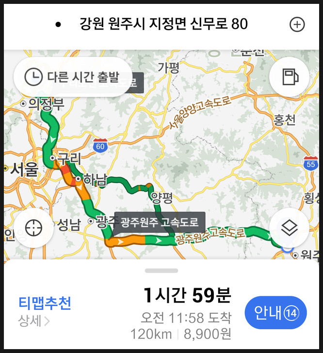 안 막히면 1시간 30분, 위 안내처럼 막히면 2시간, 실제로는 더 막혀서 2시간 20분 걸렸습니다