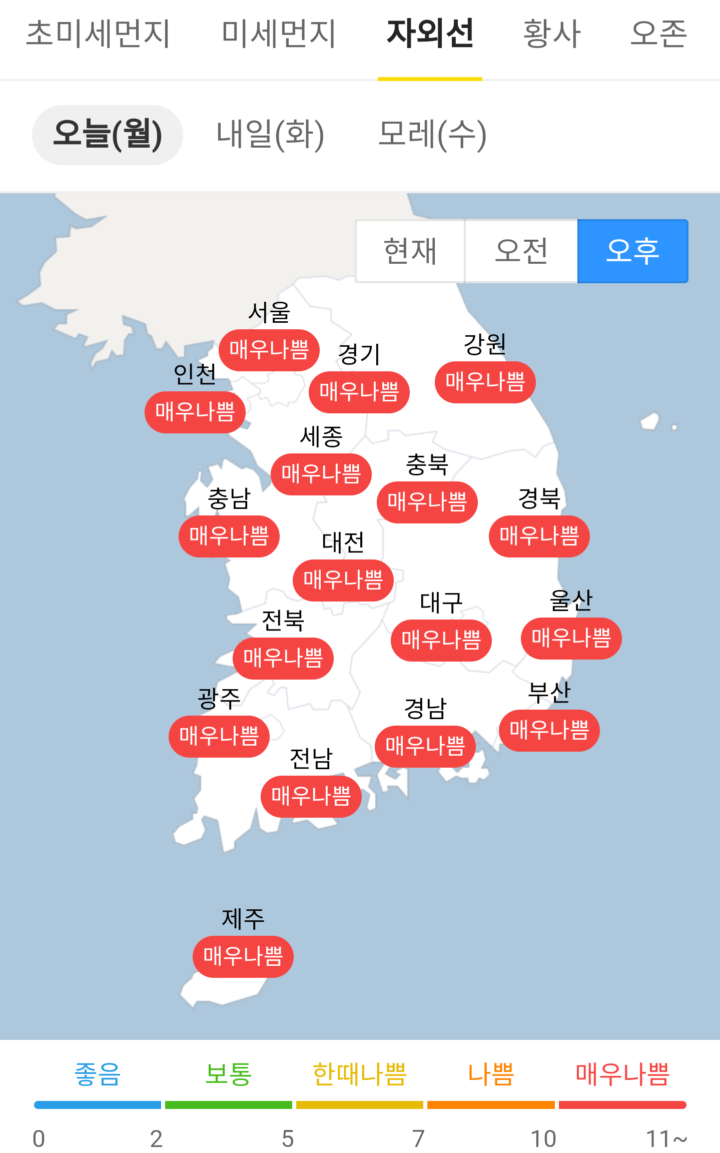 오늘의 자외선 지수 = (오후 기준) 매우 나쁨입니다 햇빛 조심해야겠어요