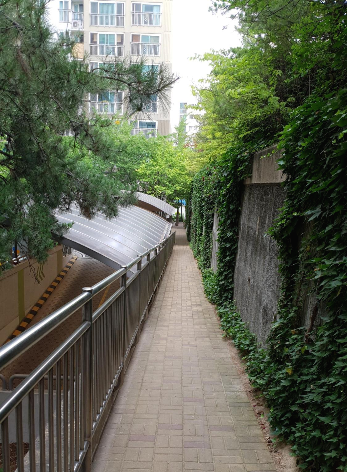 노래를 듣지 않았습니다. 아파트단지의 오솔길들이 주변 환경과 어우러져 만들어내는 소실점 구도에 집중해 보았습니다. 소실점 구도가 주는 집중감이 있죠. 길과 나무들이 산책하는 사람의 마음을 집중시켜주는 느낌입니다.