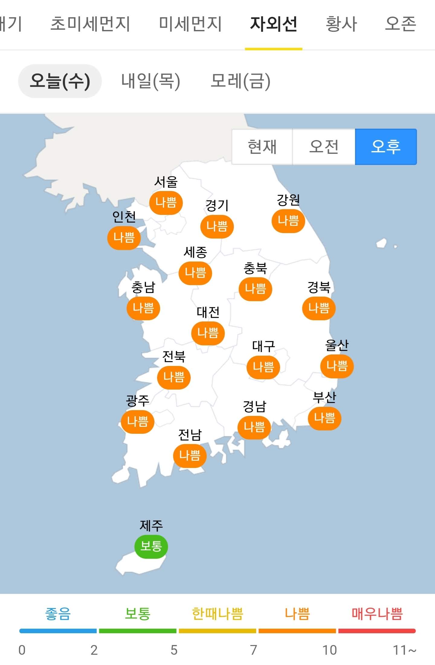 오늘의 자외선 지수 = (오후 기준) 나쁨 수준입니다