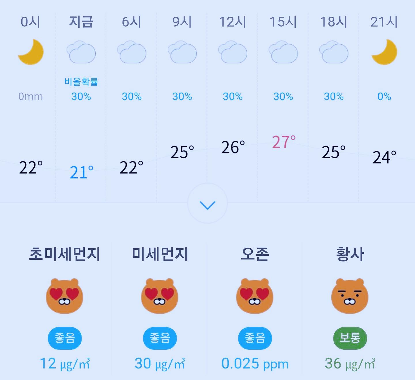 최저기온 21도, 최고기온 27도