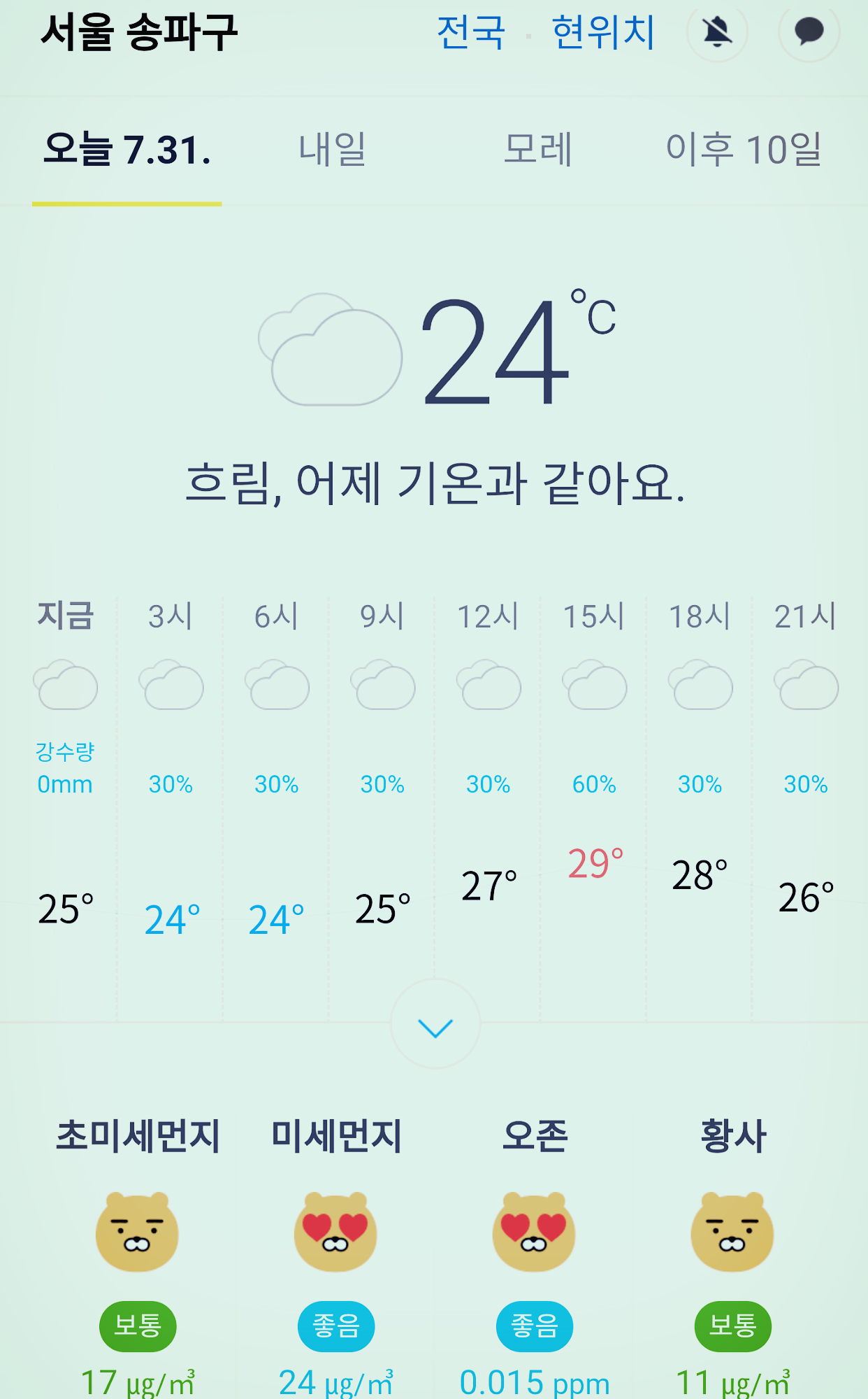 >>>서울 강남 송파구 날씨 2020년 7월 31일. 서울 강남구 오늘의 날씨, 오늘 날씨, 2020 0731, 초미세먼지, 미세먼지, 자외선