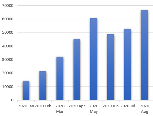 2020년 1월부터 8월까지의 방문수 추이는 아래 그래프와 같습니다.