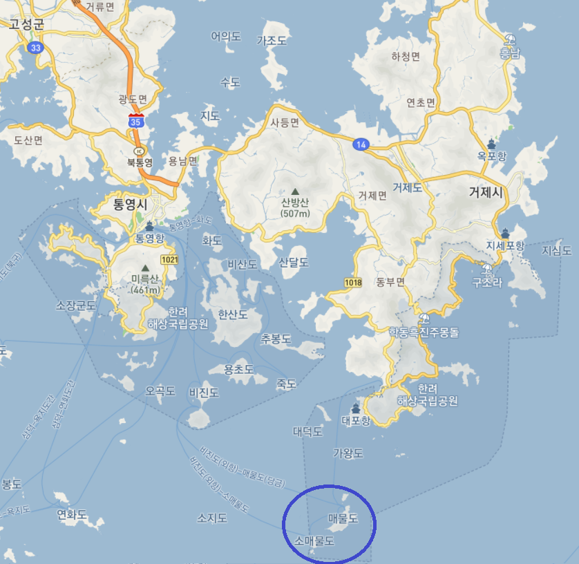 지도에서 보듯, 매물도와 소매물도는 거제도와 가깝습니다. 거제도 부속섬으로 착각될 만하구요.