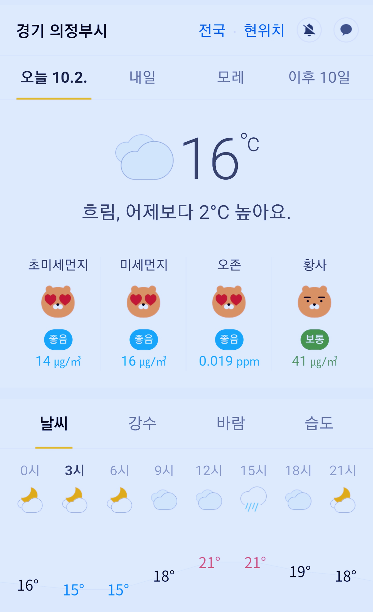 경기도 의정부시 추석 연휴 셋째날 오늘의 날씨 2020년 10월 2일 (4시 30분 현재)