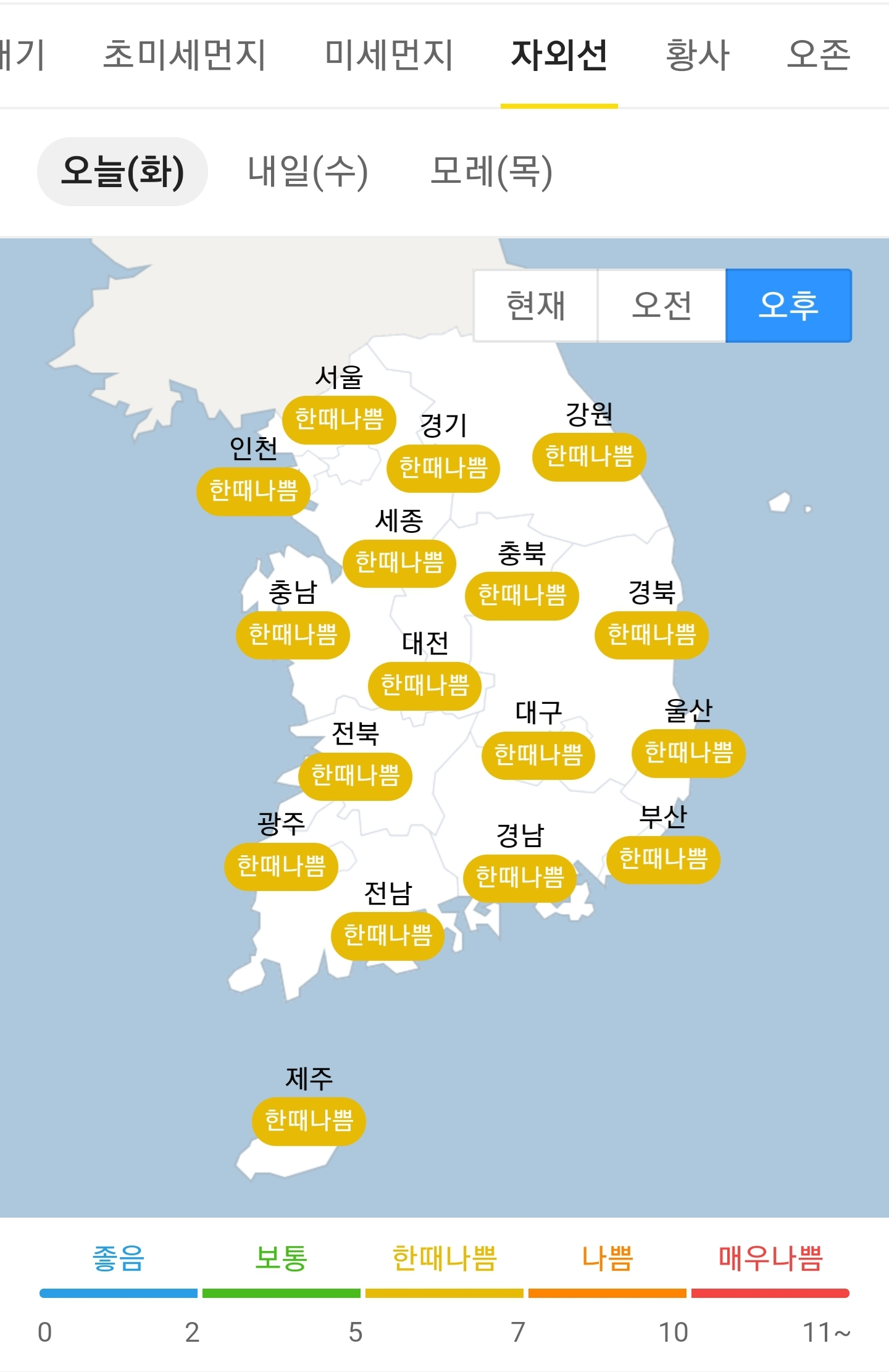 오늘의 자외선 지수 = (오후 기준) 한때 나쁨 입니다