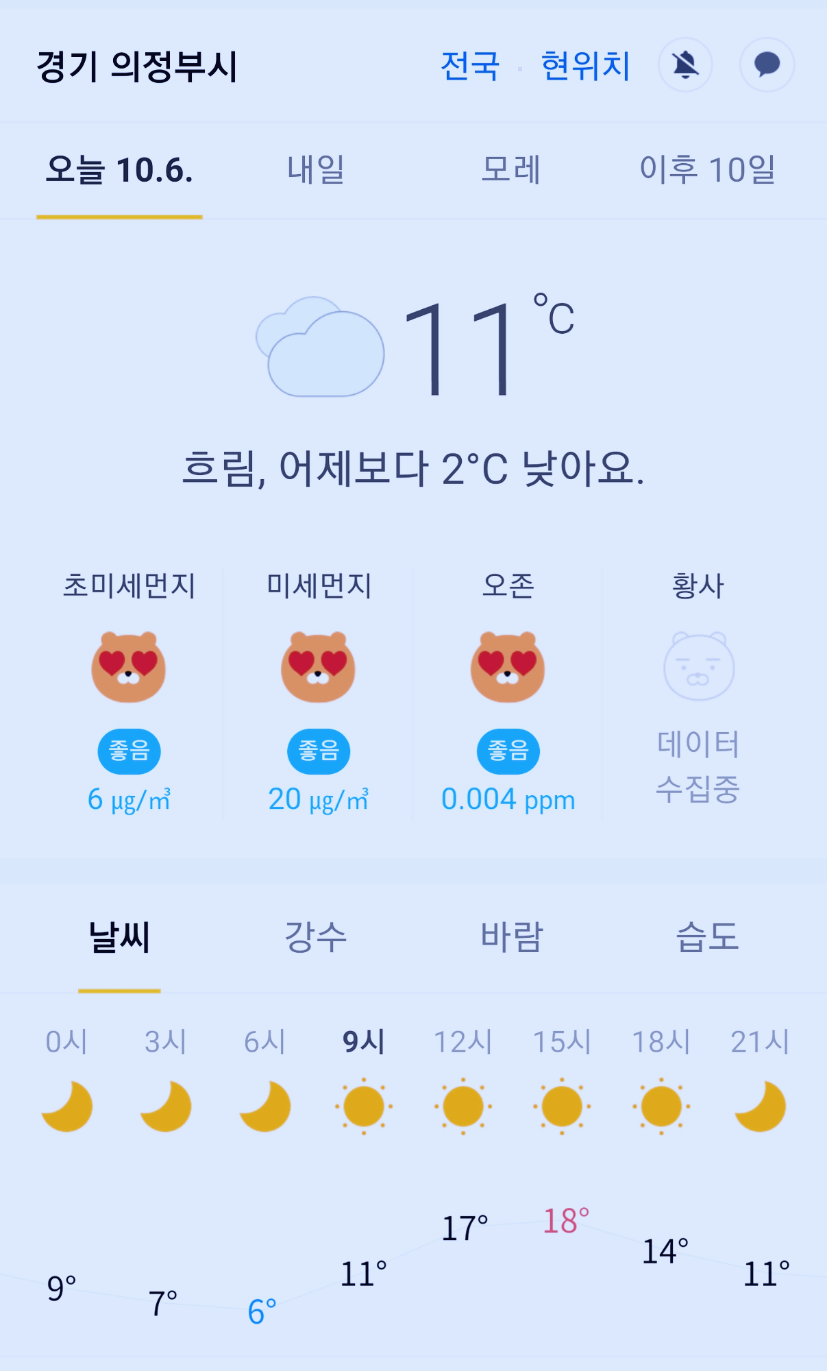 경기도 의정부시 오늘의 날씨 2020년 10월 6일 (9시 현재)