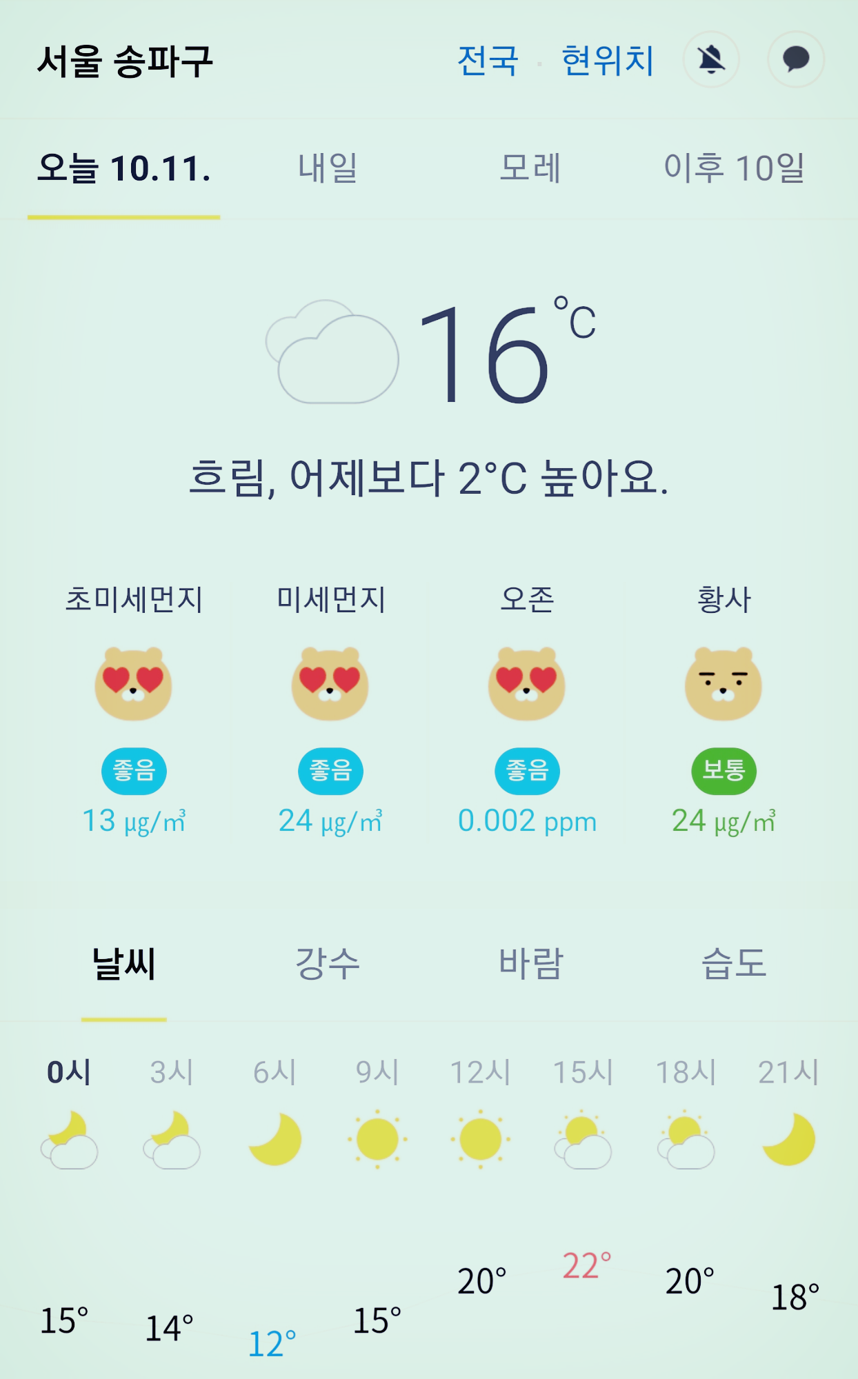 서울 강남 송파구 오늘의 날씨 2020년 10월 11일 (0시 30분 현재)