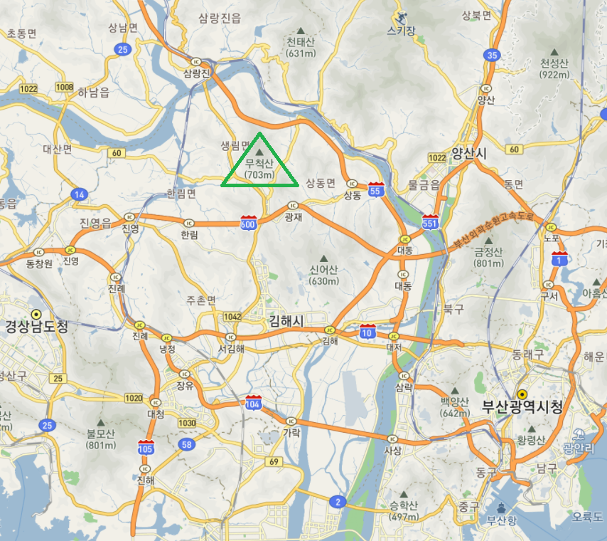 아래 지도에서 표시된 곳이 김해시 무척산입니다.