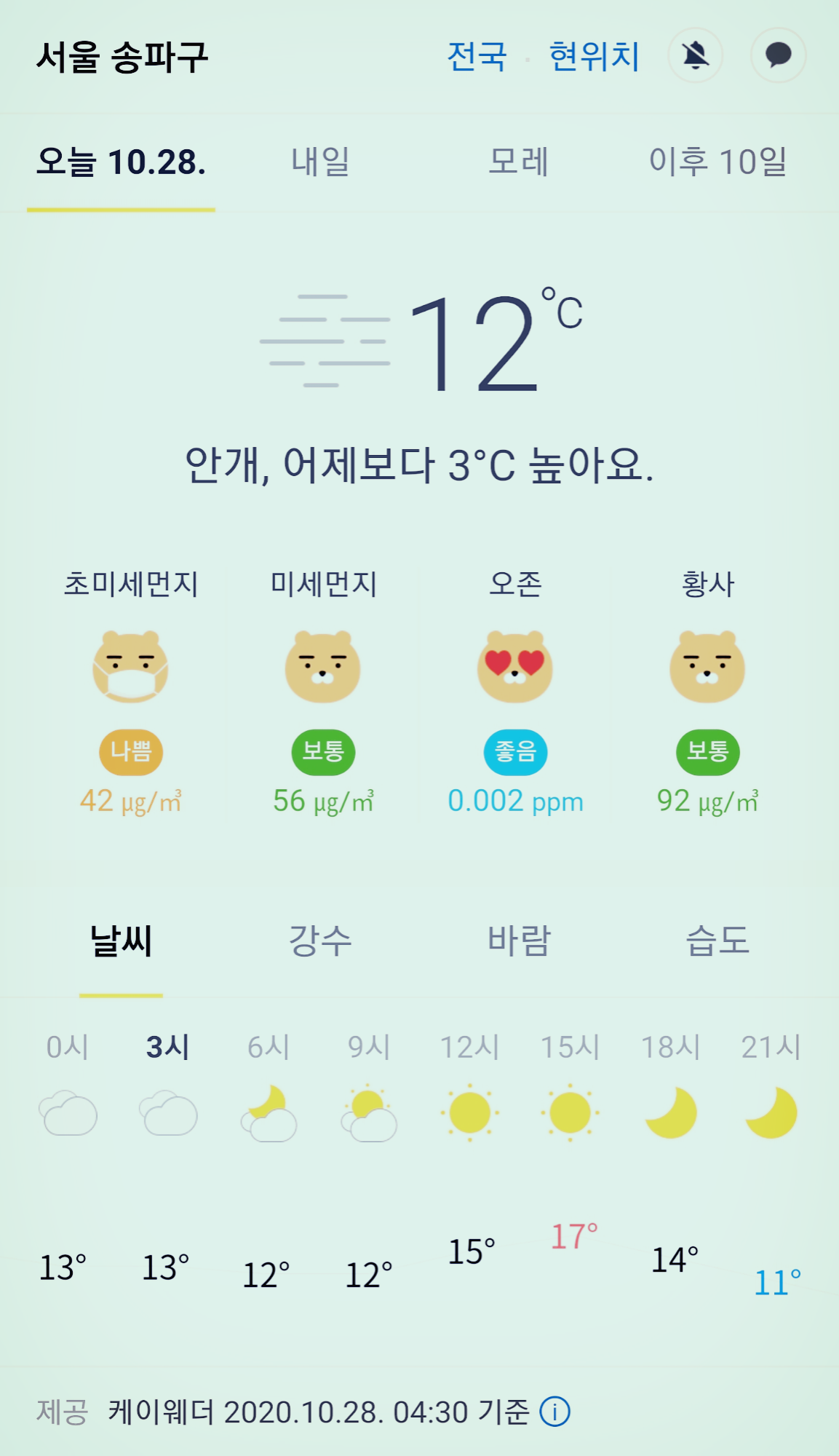 서울 강남 송파구 오늘의 날씨 2020년 10월 28일 (4시 30분 현재)
