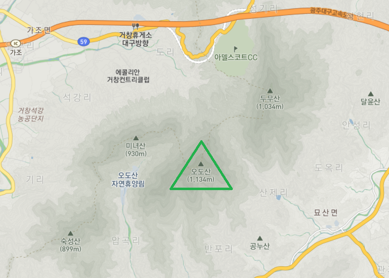 아래 지도에서 표시된 곳이 경남 거창 오도산, 경남 합천 오도산입니다.