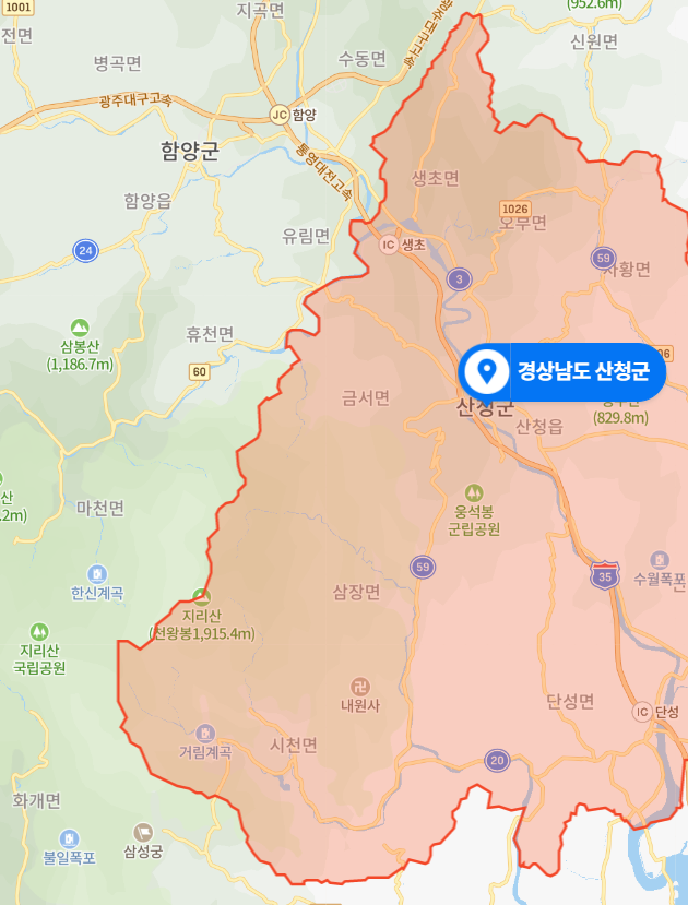 아래 지도에서 표시된 곳이 경상남도 산청군입니다.
