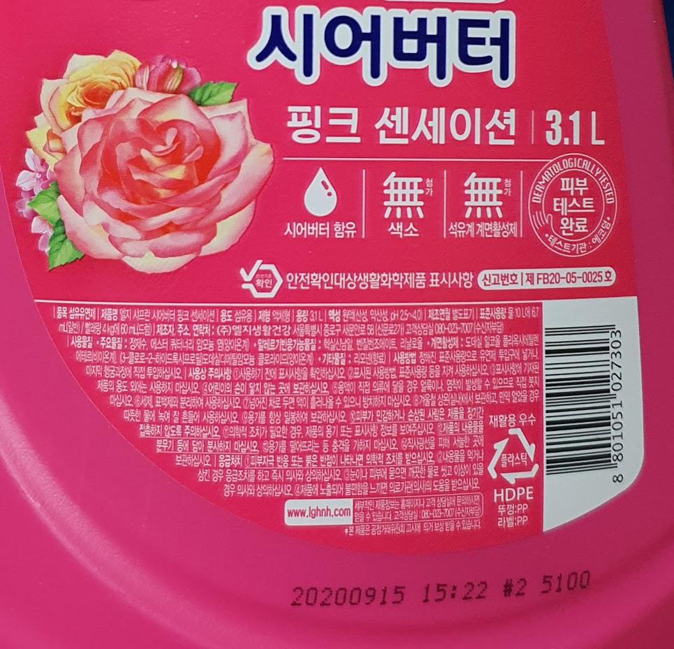 바꾼 후 세탁기 돌릴 때 이제 '고농축 섬유유연제가 주는 희석에 대한 염려'가 없다. 마음이 가볍다. 우리집에서 앞으로 점도 높은 고농축 섬유유연제로 되돌아 갈 일은 아마도 없을 것이다. 아, 샤프란 시어버터 핑크 센세이션, 향도 괜찮은 편이다. 빨래 후에, 널 때, 건조한 후에, 은은한 향이 괜찮다.