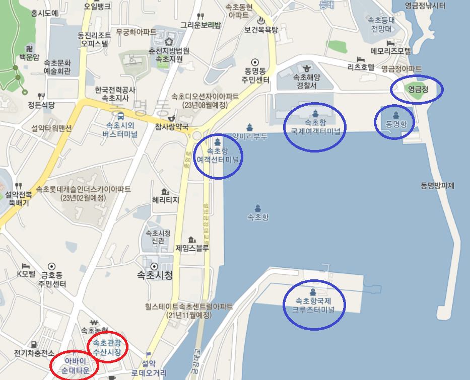 아래 지도에서 표시된 곳이 속초항 여객선 터미널, 동명항, 영금정입니다.