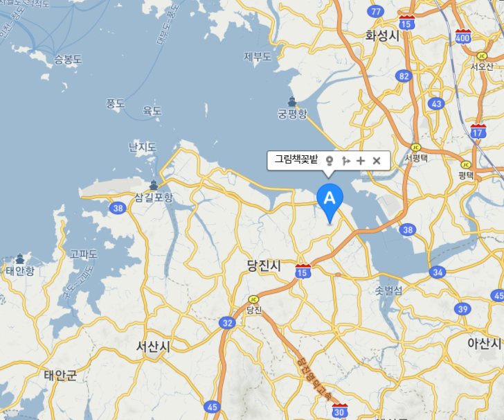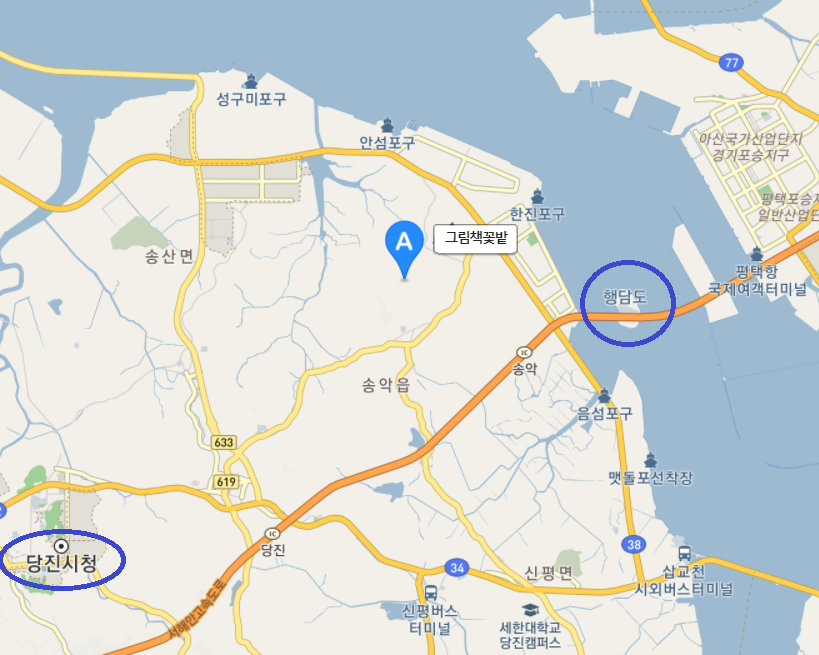 지도 좌하단의 당진시청과 지도 우측의 행담도를 참고하면 김미자 권이병 씨 부부의 당진 그림책 꽃밭 위치가 쉽게 가늠될 것 같습니다.
