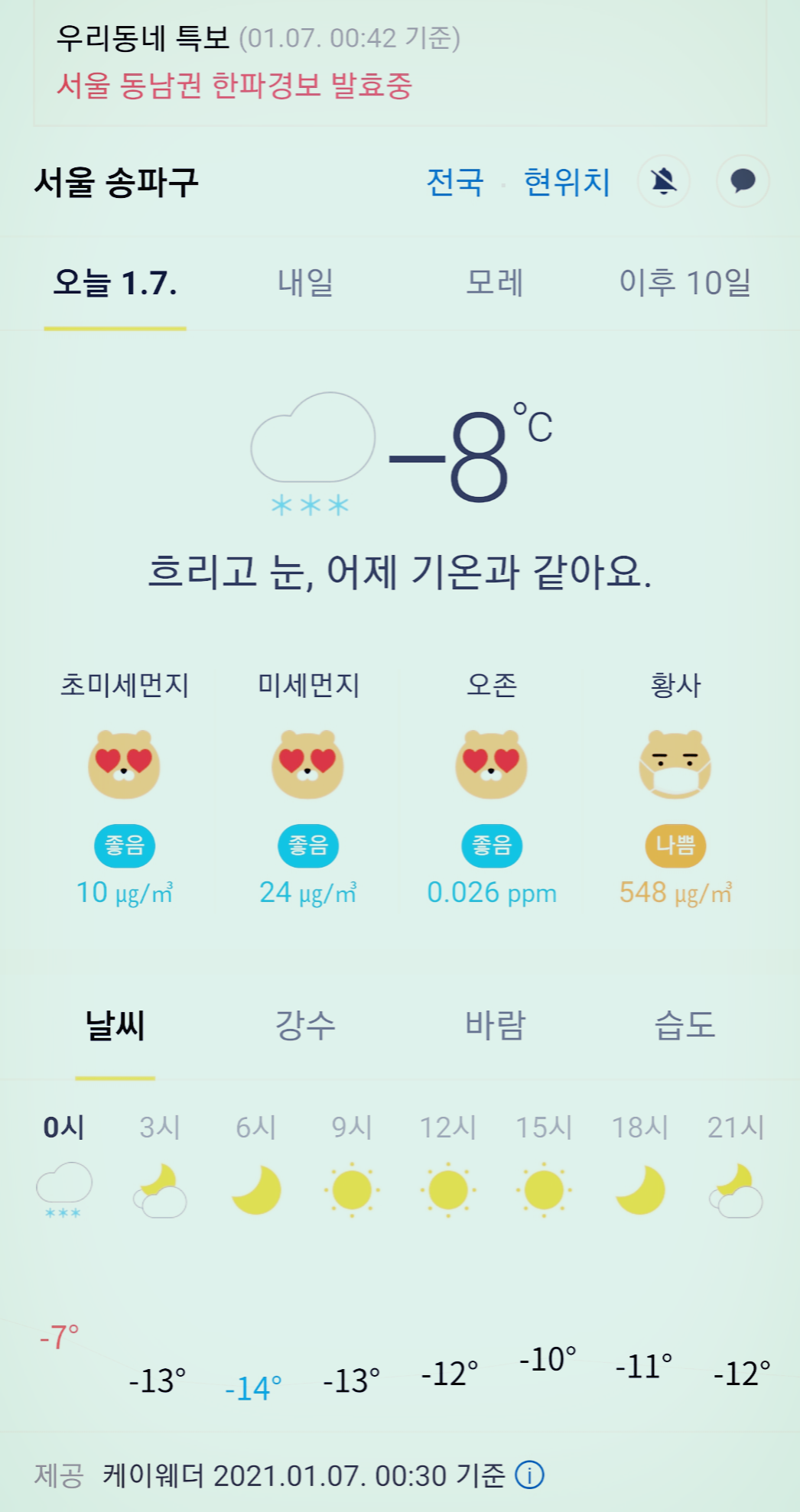 >>>서울 강남 송파구 날씨 2021년 1월 7일. 서울 강남구 오늘의 날씨, 한파경보 발효중, 오늘 날씨, 2021 0107, 초미세먼지, 미세먼지