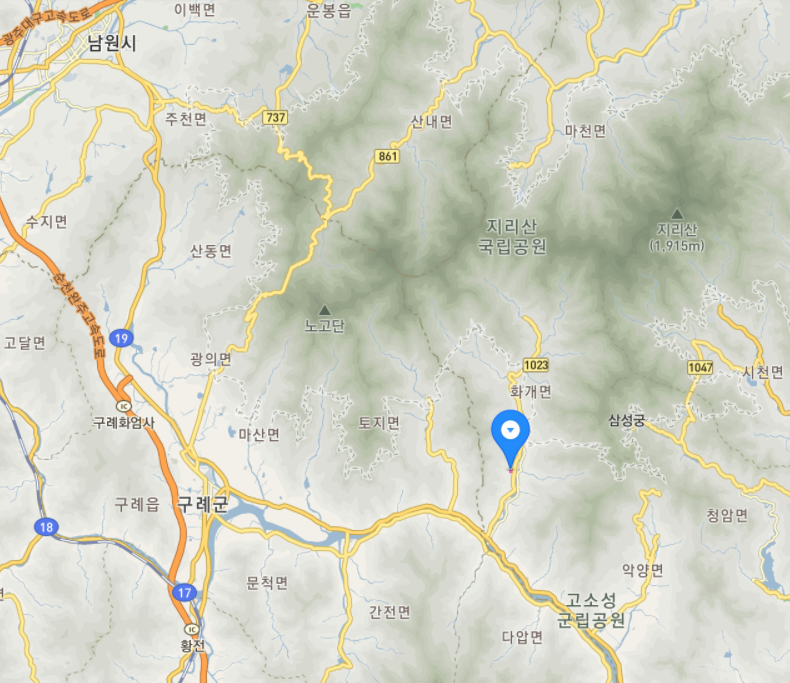 지도에서 보듯, 화개골은 구례군청에서 멀지 않습니다. 구례군청에서 화개골 자혜정사까지 도로 기준으로 20km 정도 됩니다. 지도 우하단 밖에 위치하는 하동군청까지는 도로 기준으로 24km 정도 됩니다.