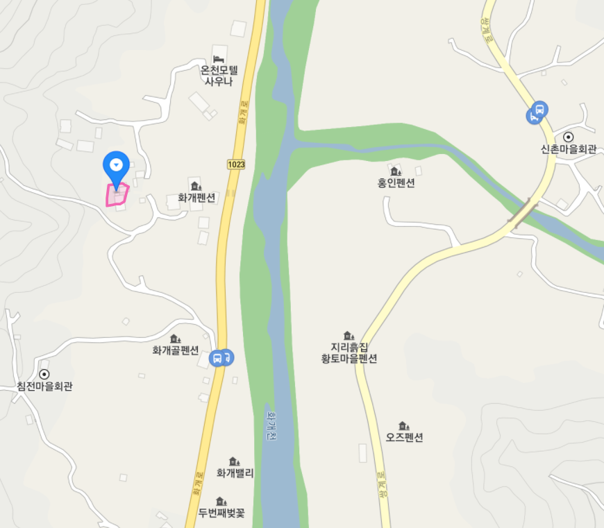 지도 좌측에 침점마을회관이, 지도 우측에 신촌마을회관이 보입니다. 두 마을은 화개천을 사이에 두고 있습니다.