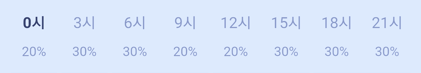 눈 또는 비 올 확률은 아래 표와 같습니다 종일 눈 또는 비 올 확률이 20-30 퍼센트입니다