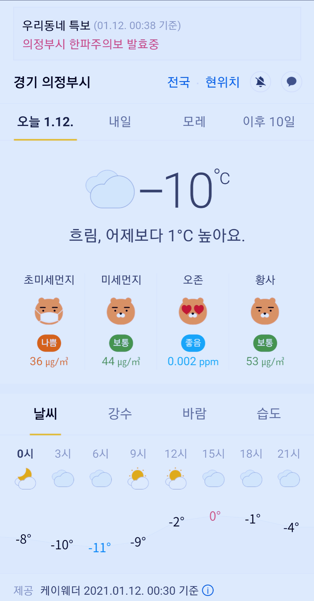 >>>경기도 의정부시 날씨 2021년 1월 12일. 오늘의 날씨, 한파주의보 발효중, 오늘 날씨, 2021 0112, 초미세먼지, 미세먼지