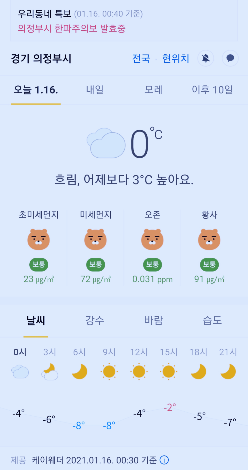경기도 의정부시 오늘의 날씨 2021년 1월 16일 (0시 30분 현재)