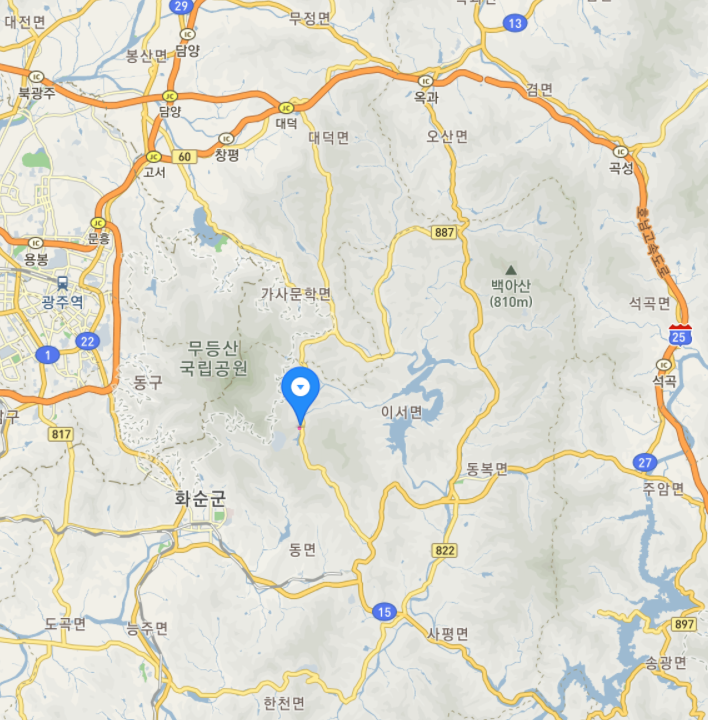 화순군 이서면 안심리는 지도에서 보듯 무등산 국립공원의 동남쪽에 위치합니다.