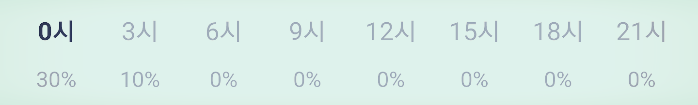 눈 또는 비 올 확률은 아래 표와 같습니다 새벽을 제외하고는 종일 0 퍼센트입니다