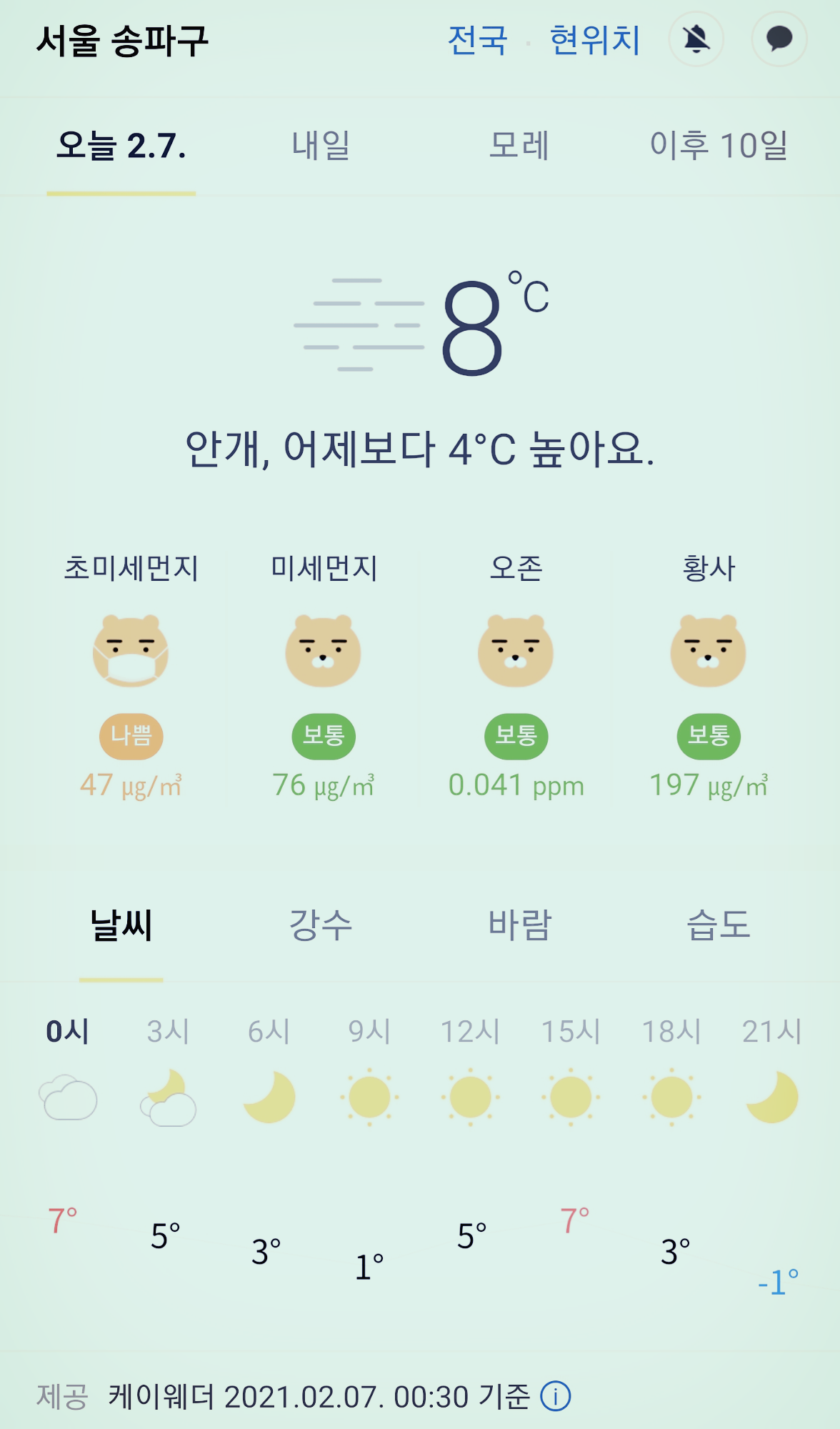 서울 강남 송파구 오늘의 날씨 2021년 2월 7일 (0시 30분 현재)