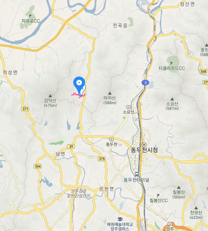 아래 지도에서 표시된 곳이 감악산 자락의 늘목리 위치입니다. 연천군 전곡읍에 속하고요.
