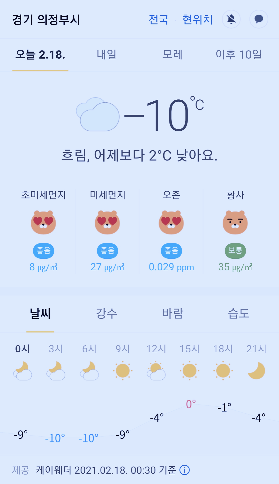 경기도 의정부시 오늘의 날씨 2021년 2월 18일 (0시 30분 현재)
