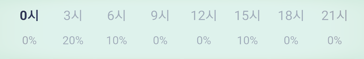 눈 또는 비 올 확률은 아래 표와 같습니다