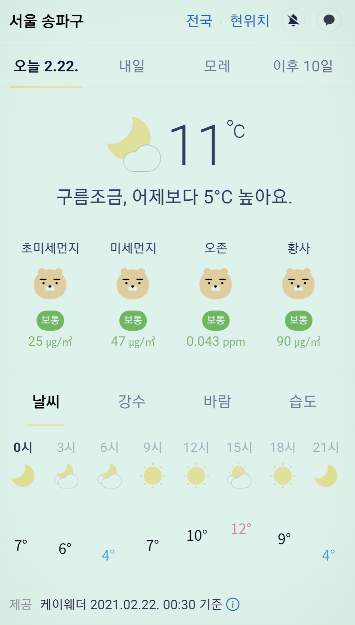 서울 강남 송파구 오늘의 날씨 2021년 2월 22일 (0시 30분 현재)