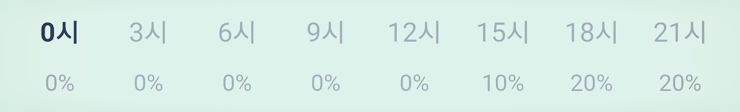눈 또는 비 올 확률은 아래 표와 같습니다 저녁부터 눈 또는 비 올 가능성이 좀 있습니다