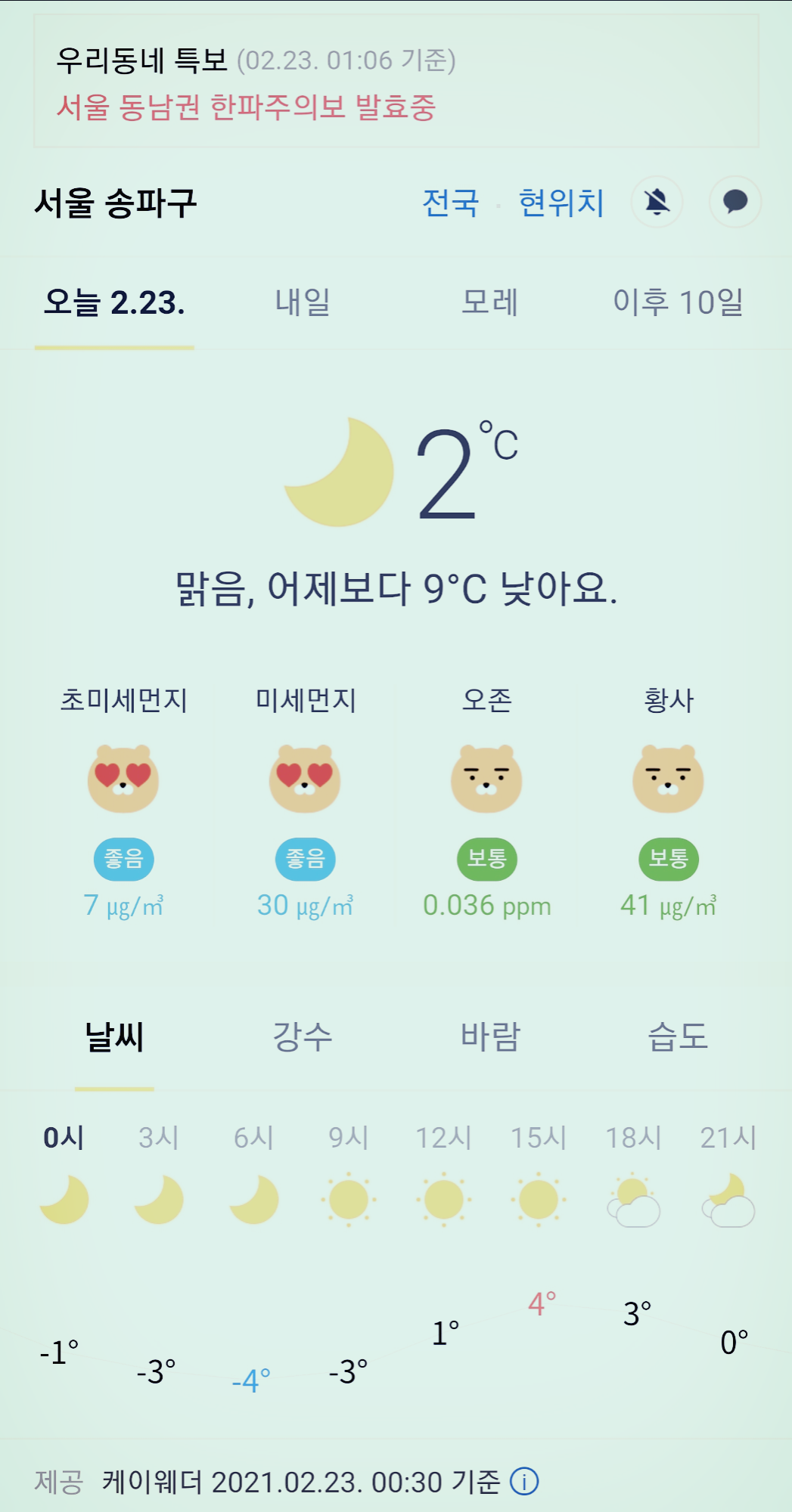 서울 강남 송파구 오늘의 날씨 2021년 2월 23일 (0시 30분 현재)