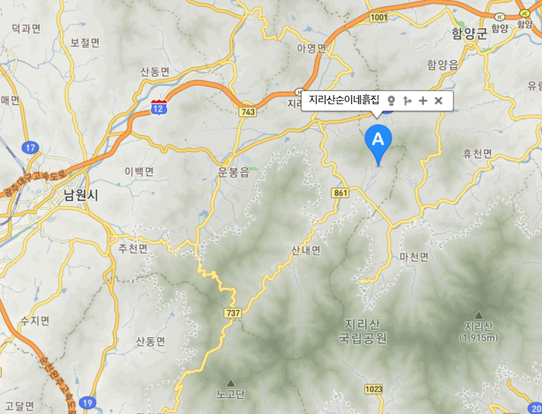 아래 지도에서 표시된 곳이 전북 남원 지리산 자락 안오순 씨의 지리산순이네흙집 위치입니다.