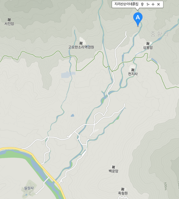 지리산순이네흙집은 중황리 골짜기 끝에 위치하는 셈입니다. 지리산순이네흙집에서 더 올라가면 삼봉산 까마귀밑골입니다.