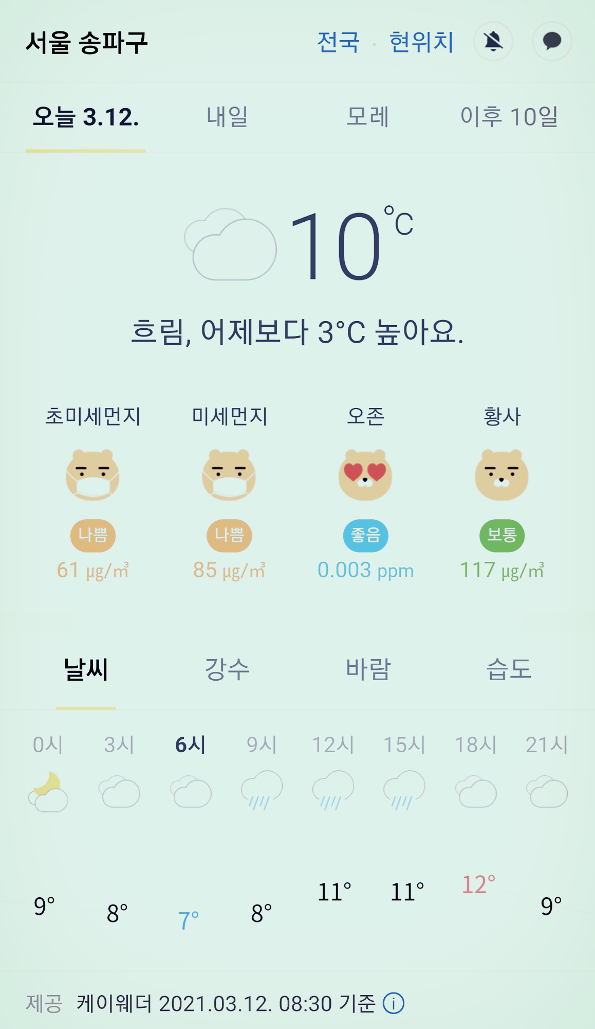 서울 강남 송파구 오늘의 날씨 2021년 3월 12일 (8시 30분 현재)