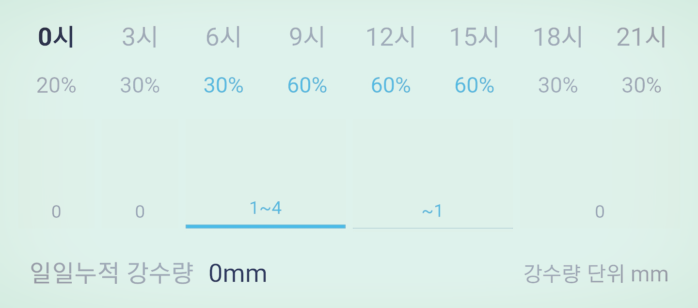 오늘 눈 또는 비 올 확률은 아래 표와 같습니다 종일 흐리고 아침에서 낮 시간에 비 소식 있습니다