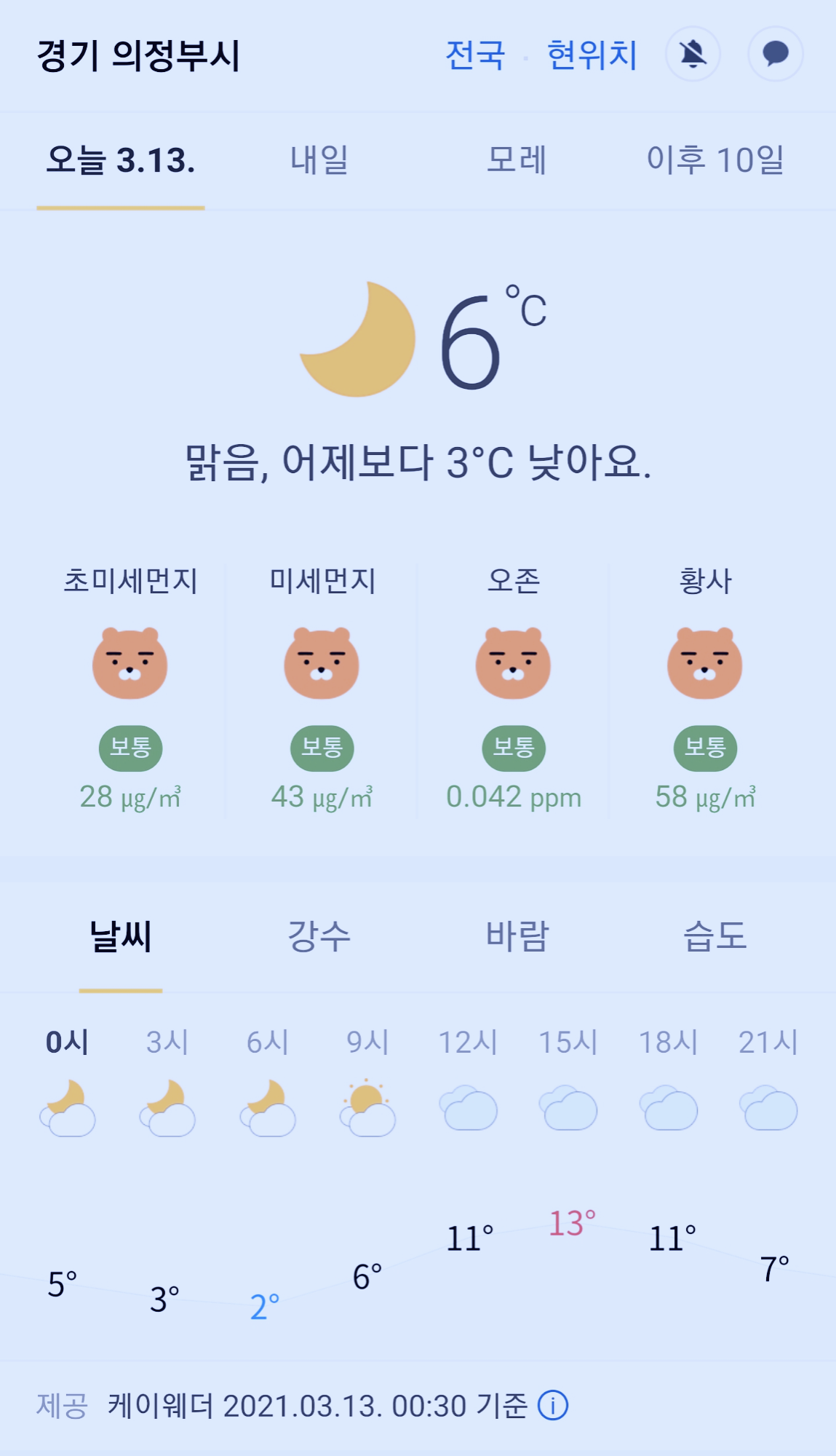 경기도 의정부시 오늘의 날씨 2021년 3월 13일 (0시 30분 현재)