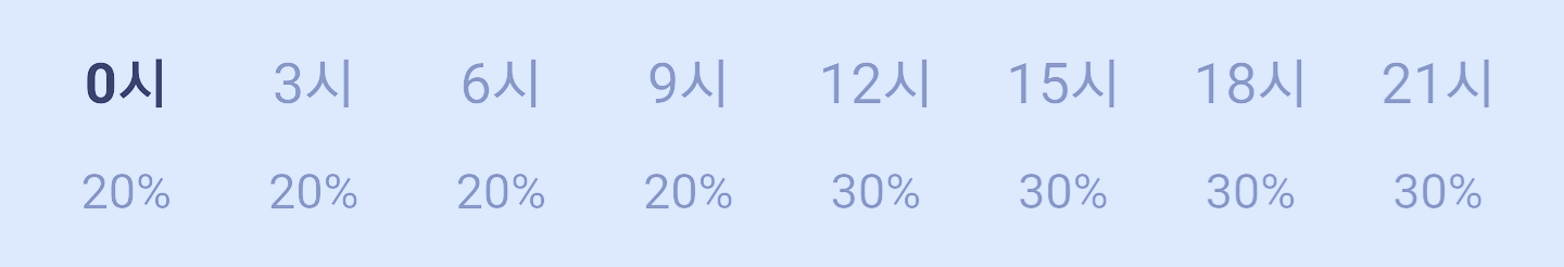 오늘 눈 또는 비 올 확률은 아래 표와 같습니다 종일 20-30 퍼센트 수준입니다