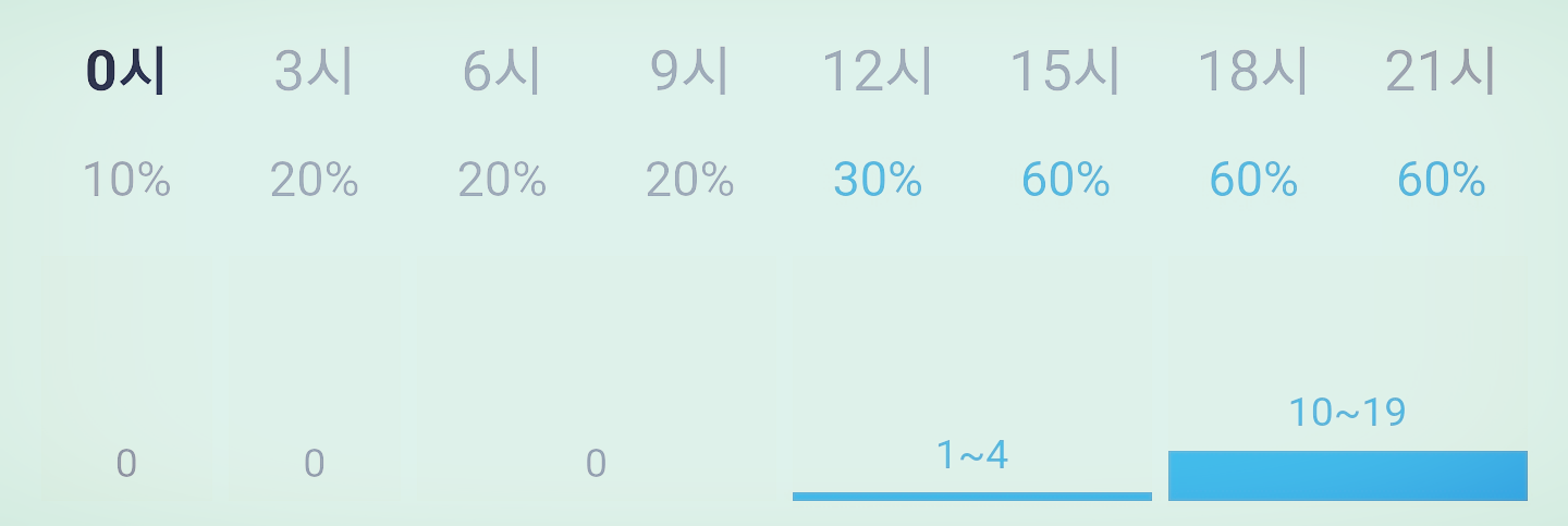 오늘 눈 또는 비 올 확률은 아래 표와 같습니다 오후에 비 소식 있습니다