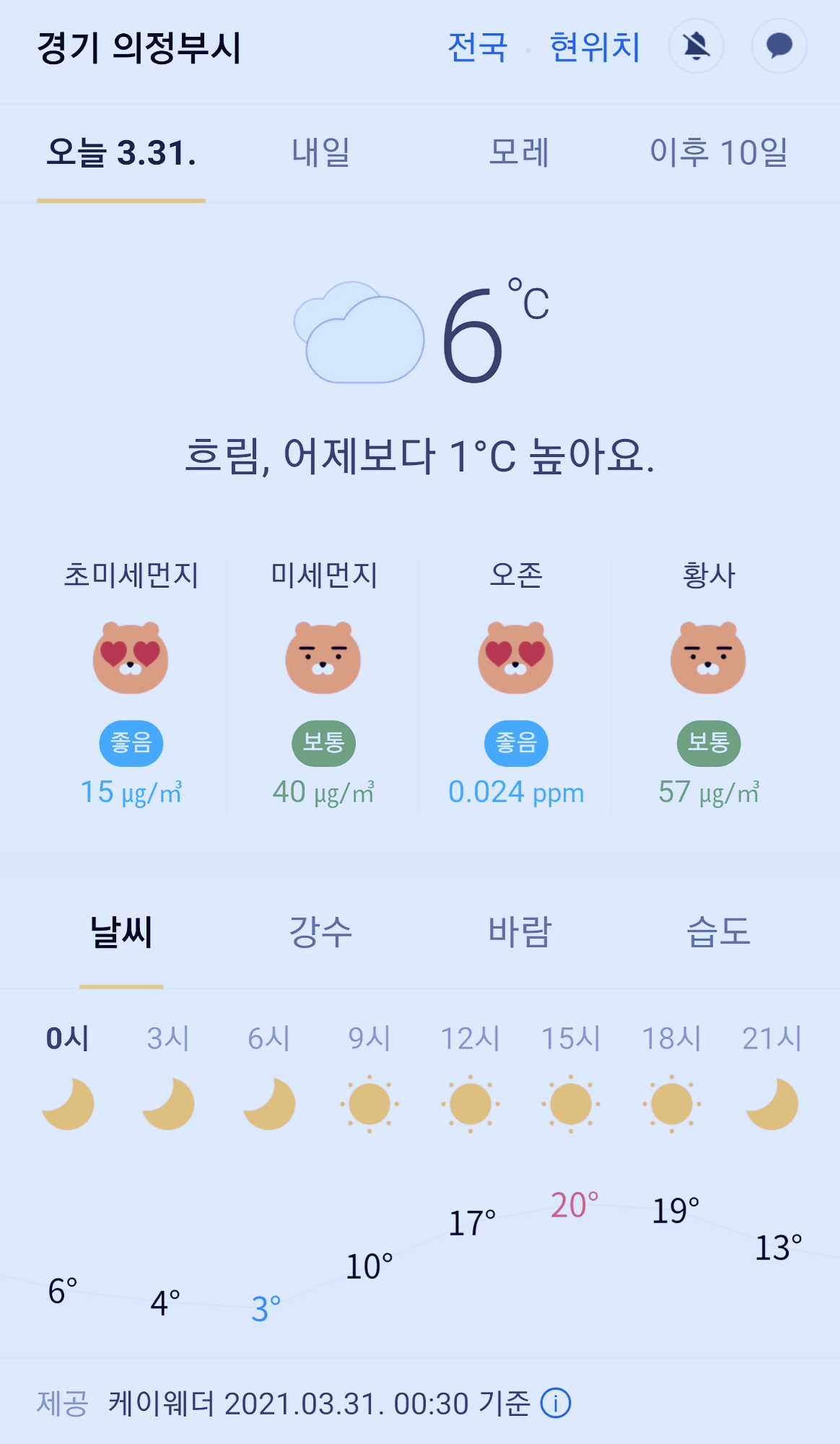 경기도 의정부시 오늘의 날씨 2021년 3월 31일 (0시 30분 현재)