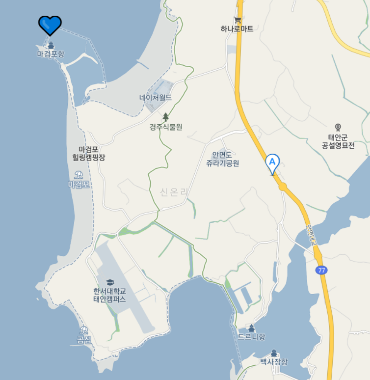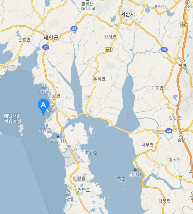 아래 지도에서 표시된 곳이 태안 마검포항입니다.