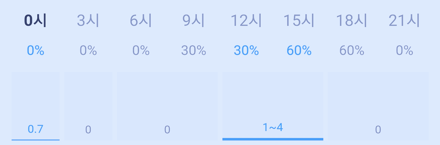 오늘 비 올 확률은 아래 표와 같습니다 낮에 비 소식 있습니다